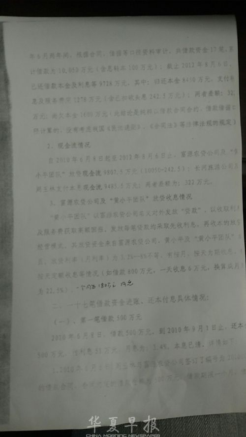 “发放每笔贷款均采取先收利息,再收本的放贷经营模式。其放贷资金来自富源农贷公司、黄小平及‘黄小平团队’成员。”审计报告对贷款进行了详细描述:2010年6月8日,借500万元,实际转账为483万元,扣“砍头息”17万元作为第一期利息。