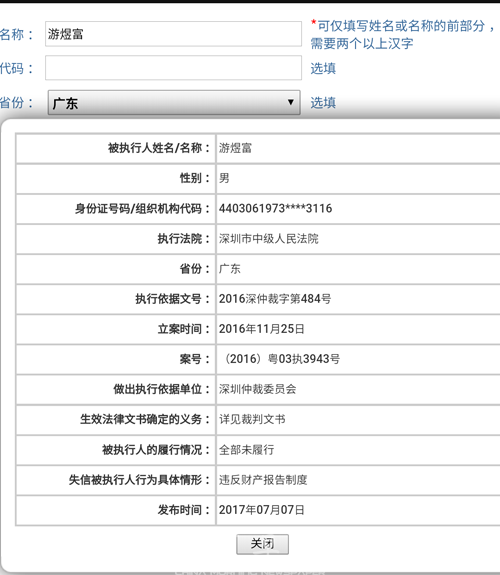 记者在全国法院被执行人信息查询中核实到,2017年7月7日,游煜富因一起诉讼被深圳市中级人民法院列入失信黑名单,该查询结果显示,游煜富的执行情况显示为全部未履行,而失信被执行人行为具体情形则显示为违反财产报告制度。