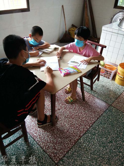 无奈的张明,回到家中,就只得带上爷爷准备的口罩。记者在张明家采访时,正值学校放学,张明和几个同学围坐在一张四方桌子边写作业,每个人都戴了一个口罩。