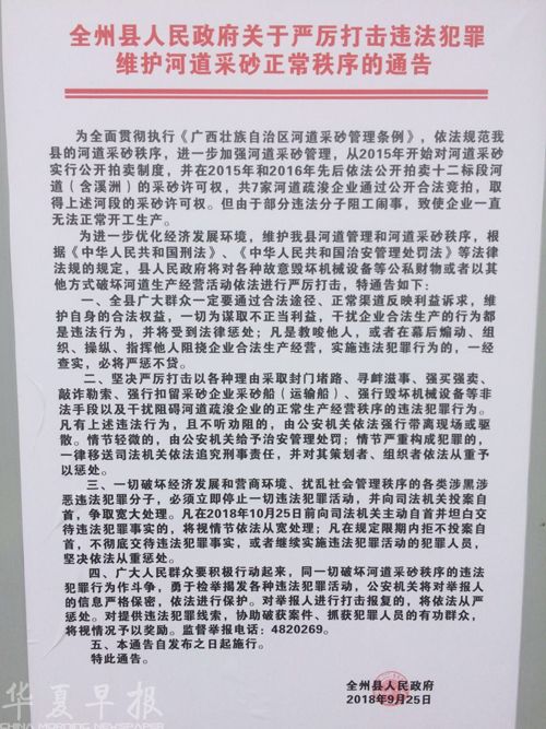 9月25日,全州县人民政府下发了一份名为《全州县人民政府关于严厉打击违法犯罪维护河道采砂正常秩序的通告》,通告称,坚决严厉打击以各种理由采取封门堵路、寻衅滋事、强买强卖、敲诈勒索、强行扣留采砂企业采砂船等违法犯罪行为,并要求10月25日违法人员主动向司法机关自首并坦白交代,违者依法从重惩处。
