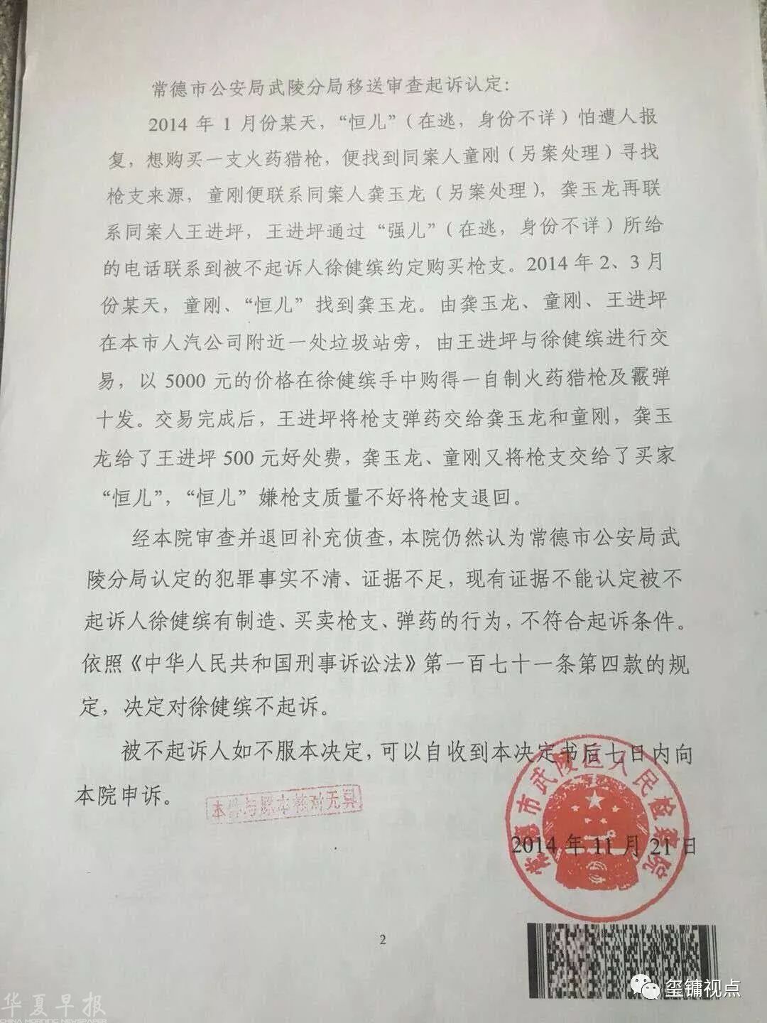 不知不觉,徐健缤“被枪王”一案过去两年了。但常德市武陵区公安分局一直不予纠错,甚至在2016年7月6日还发出了一份《关于徐健缤案件的情况证明》,称常德市公安局胡丘陵局长高度重视,指示武陵分局成立专案,务必查清嫌疑人的全部犯罪事实并依法予以落实到位。检察机关已给予了徐健缤国家刑事赔偿,公安机关却权大于法,个中猫腻,发人深思。