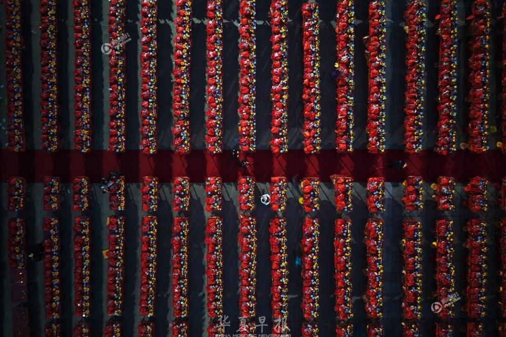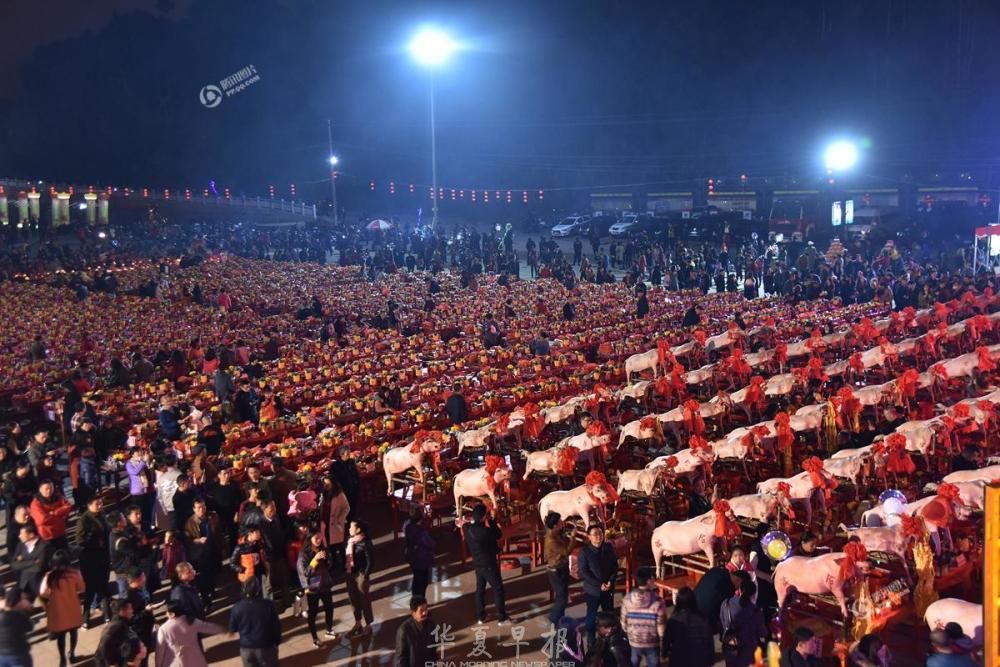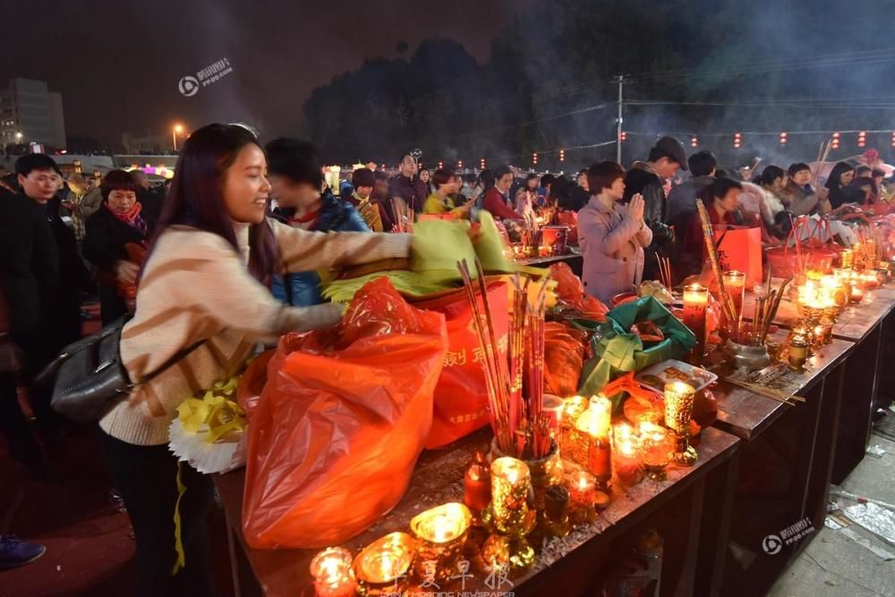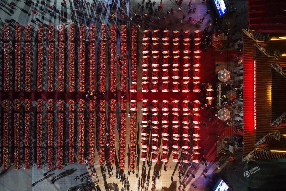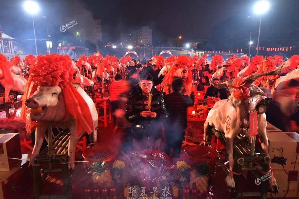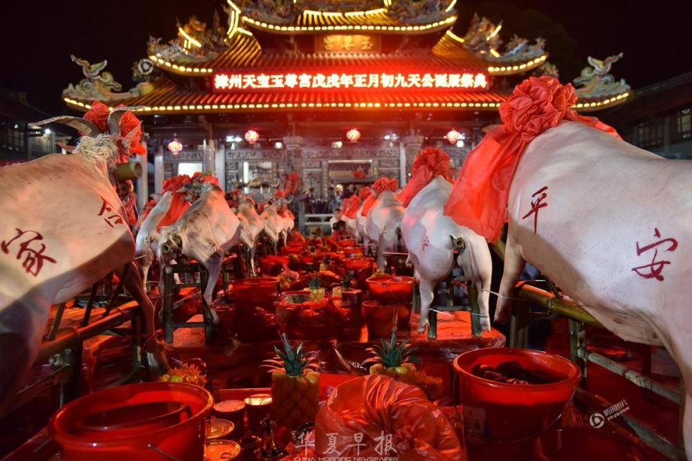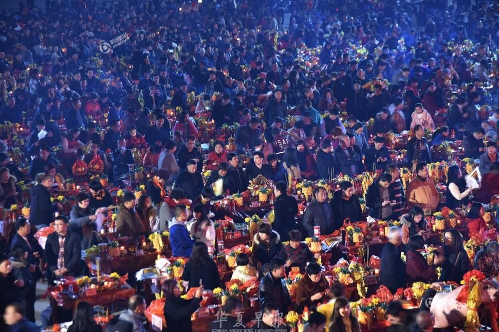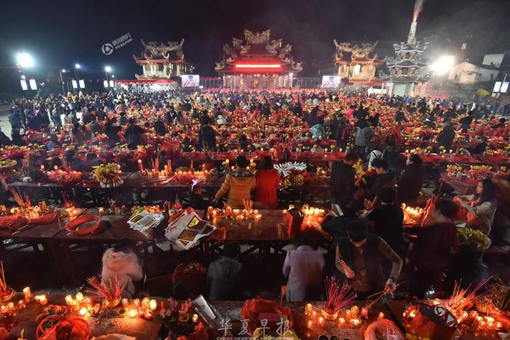 2018年2月23日,农历正月初九,福建漳州天宝镇珠里村玉尊宫举行盛大的拜天公传统习俗,广场上整整齐齐摆满了几百多张桌子,桌子上摆满各色供品,拜祭的信众们以此祭拜天公,场面蔚为壮观。