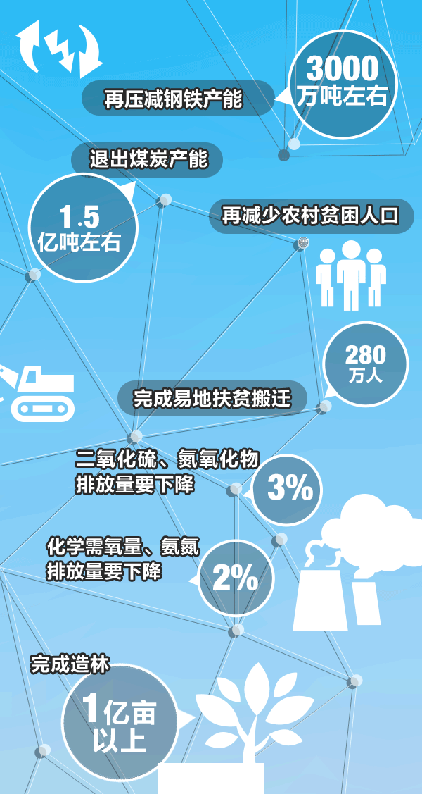 去产能:再压减钢铁产能3000万吨左右,退出煤炭产能1.5亿吨左右。