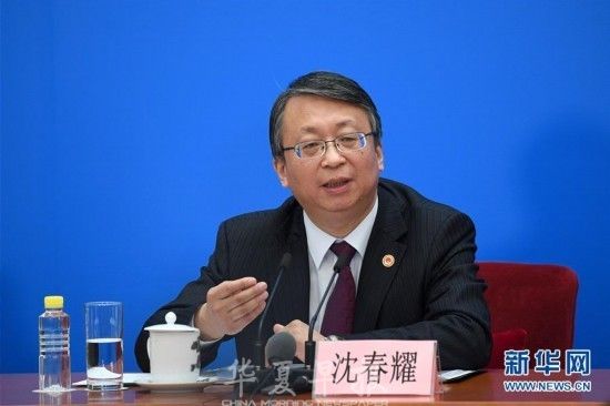3月11日,十三届全国人大一次会议秘书处法案组组长、全国人大常委会法工委主任沈春耀,法案组副组长、全国人大常委会法工委副主任郑淑娜就宪法修正案相关问题回答中外记者提问。这是沈春耀回答记者提问。新华社记者王建华摄