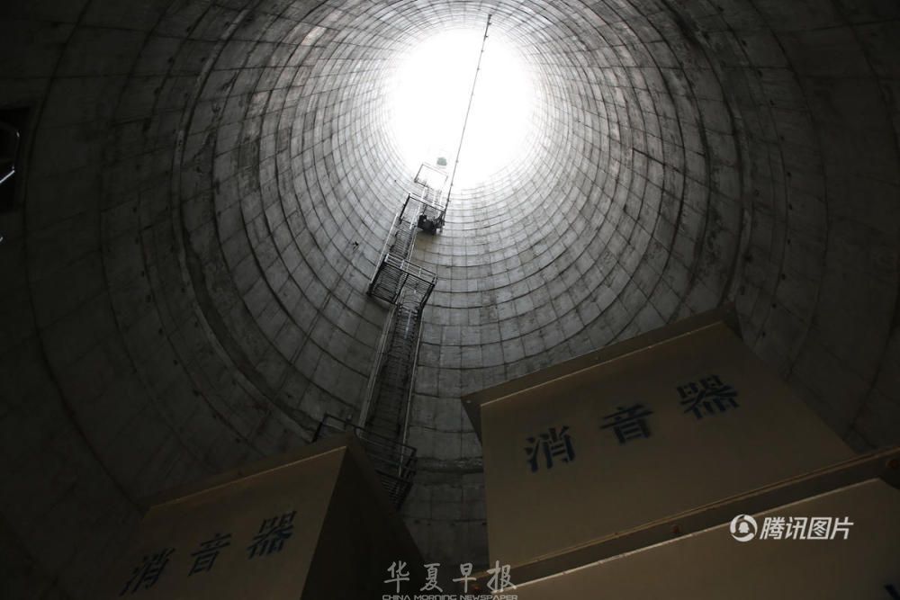 从室外进入塔体内部,首先感受到的是凉风习习,头发随风飘扬,这就是空气被吸入循环的效果。塔底部有两个大的风机,是为了促进空气循环而加设的,风机上面是消音器,因此内部噪音很小。塔身中间是空的,向上望去,宛如在井底,望见一片天空,除了塔壁有能向上攀登的阶梯以及照明设施,再无他物。