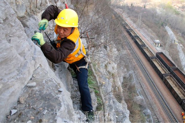 时间紧,任务重,捅山工们每一次工作都是在和时间“赛跑”。清理危石的过程会给来往车辆带来危险,因此,每天早上的七点到九点,该路段没有火车通过,为清理危石工作留出了120分钟的“天窗”期。20多位捅山工必须在这段时间内,完成当天的危石清理工作,以免落石砸到火车,途中不仅不能换人,还要防止被头顶上掉下的石头砸伤,脚下稍不留神就会踩空,难度系数很高。