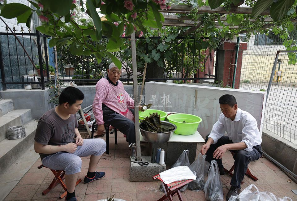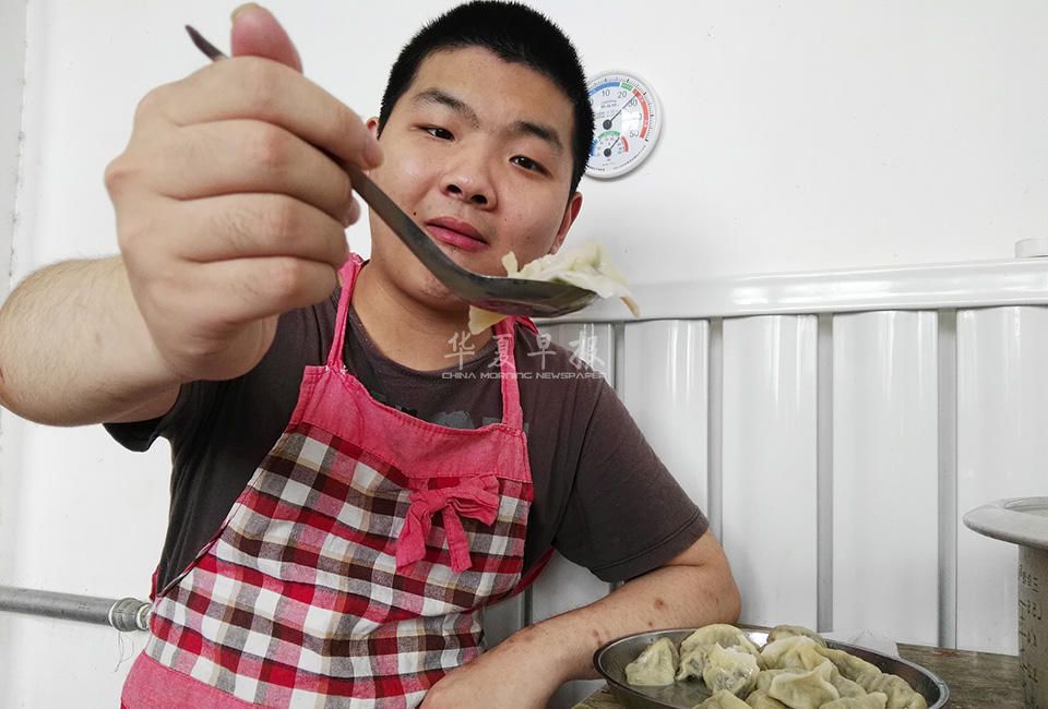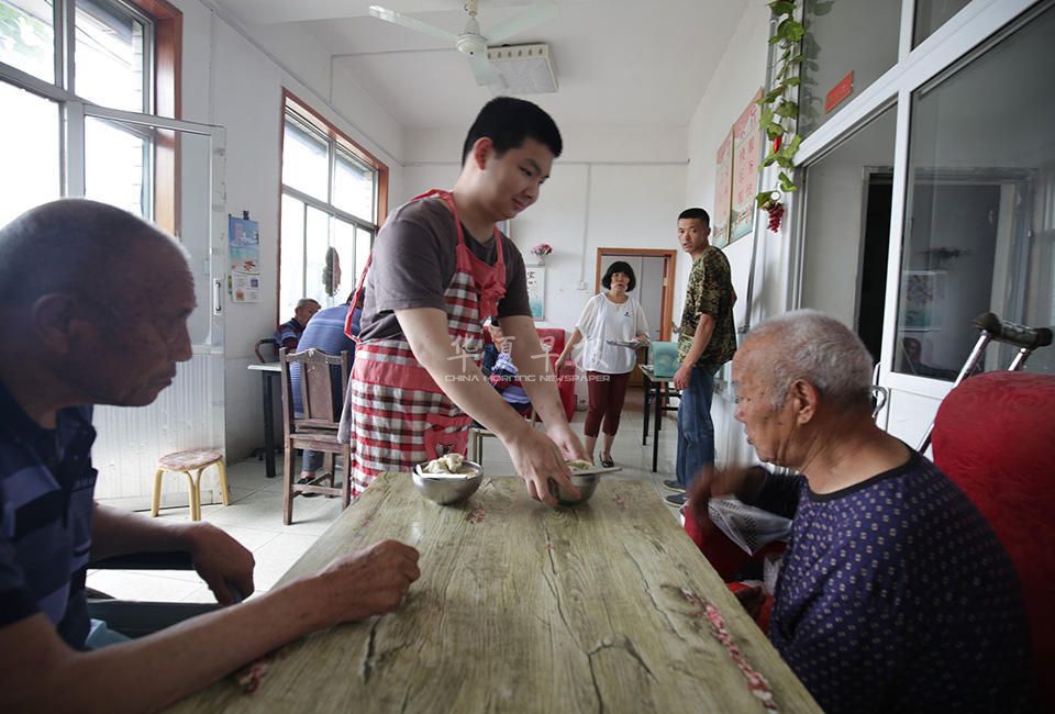 “把孩子送进养老公寓,纯属意外。”广振的妈妈说。她曾经被朋友介绍到这个敬老院,当时就想,孩子这样,只好试试看吧,临时呆呆不行再接回来。结果发现广振也很喜欢那里。“走的时候说妈妈拜拜,这说明他真喜欢在那里呆了。”图为广振给老人端饭。