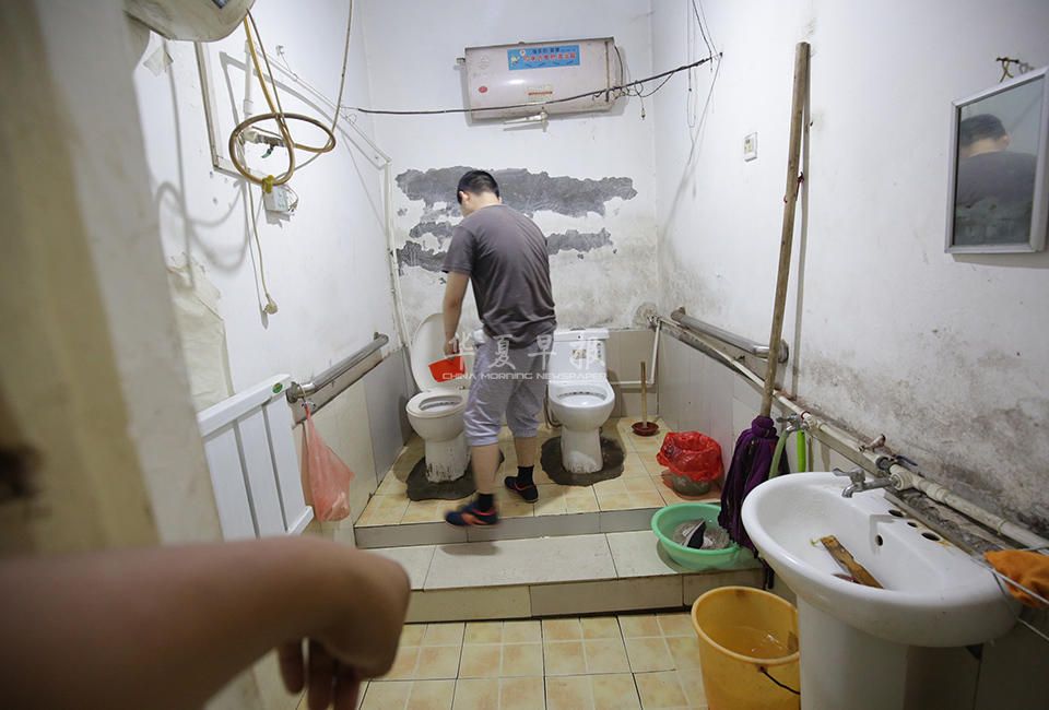 广振的生活已基本上融入老年公寓的日常生活中去了。图为广振在清扫卫生间。