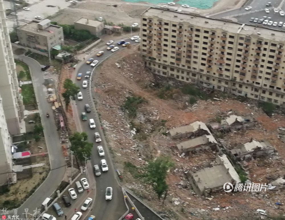 弯道内侧,一栋老居民楼和棚户区未能顺利拆迁。