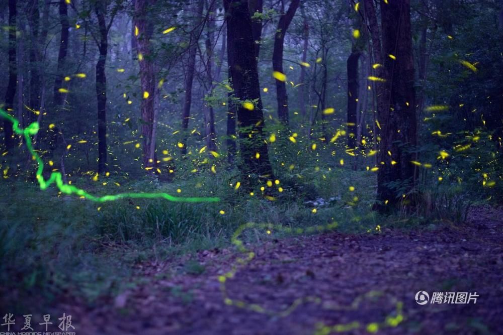 7月8日夜晚时分,成群的萤火虫在南京紫金山灵谷寺公园的树林中飞舞,星星点点的亮光宛如夜空中的繁星,仿佛成了一个奇幻的精灵世界。