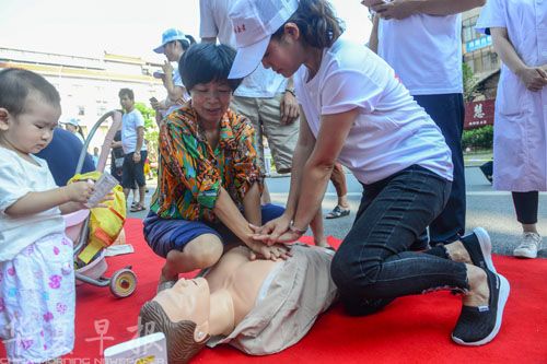 医护人员在教授市民进行急救。