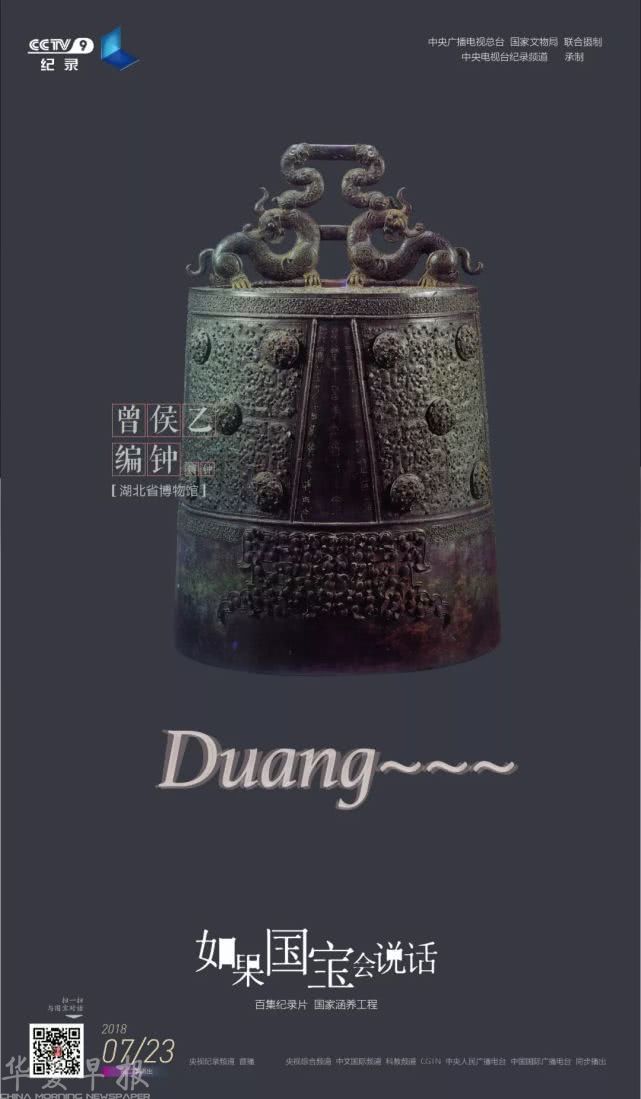 曾侯乙编钟共有64件,另有楚王所送的镈钟一件。除镈钟以外,每件钟均标识有两个不同的音名。也许你还没有欣赏过单枚编钟发出的声音,1986年湖北省博物馆、中国唱片总公司联合采录“曾侯乙编钟原声”,八音克谐,天相夺伦,神人以合。那是——