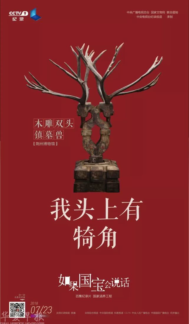 它叫镇墓兽,曾被放在墓穴中,用来保护墓主人的“安全”。四只麋鹿角向外生长,预示生命的开始。诞生在楚国大地,一呼一吸间,镇墓兽已存在千年,以木头和动物的角质对抗时间的销蚀,依然完好——