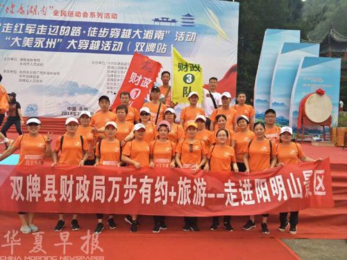 华夏早报湖南永州8月8日讯(记者 唐博 通讯员 伍业星)7月21日,由湖南省体育局和永州市人民政府主办、市文体广电新闻出版局和双牌县委、县人民政府承办的“走红军走过的路徒步穿越大湘南”暨“大美永州”大穿越活动(双牌站)在永州阳明山举行,大赛分为专业组、大众组和趣味组由来自来自全国各地的722位选手分别参加了此次比赛,双牌县财政局在局领导的带领下有将近30名徒步爱好者参加了大众组的比赛。
