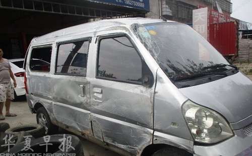 图为侧翻后的面包车。
