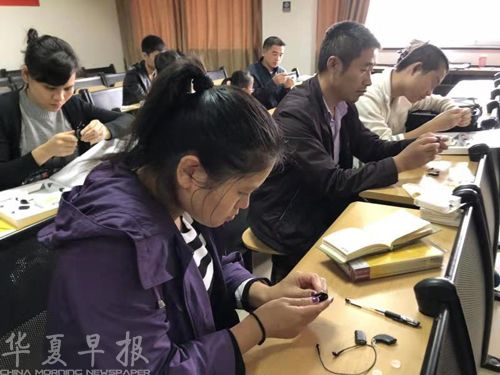 家长认真学习人工耳蜗安装、使用知识。