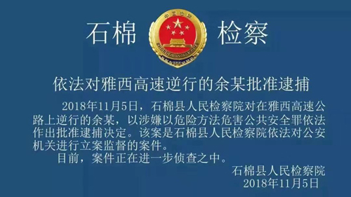 华夏早报四川雅安讯(记者 邓雅江)11月5日,四川省石棉县人民检察院依法对此前高速逆行的小轿车司机批准逮捕。