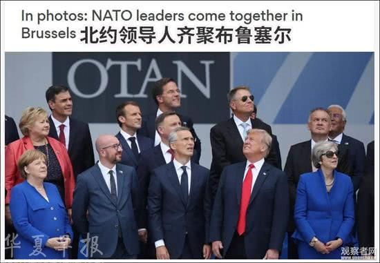 7月11日,在比利时布鲁塞尔参加北约峰会的特朗普,与“盟友”们“仰望天空”