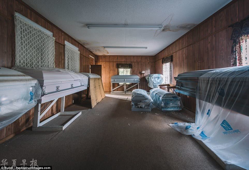 这处豪宅还曾被当做殡仪馆使用,这为它增加了一丝恐怖的气氛。当年豪宅一楼被充当殡仪馆时,主人和家人们就居住在楼上。图为豪宅内摆放的崭新棺材。