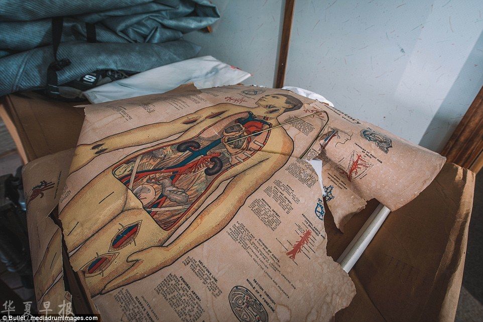 这张人体解剖图是探险者在充当殡仪馆的房间内发现的。这座豪宅当年为何被遗弃,它的主人去了哪里,至今仍然无人知晓。