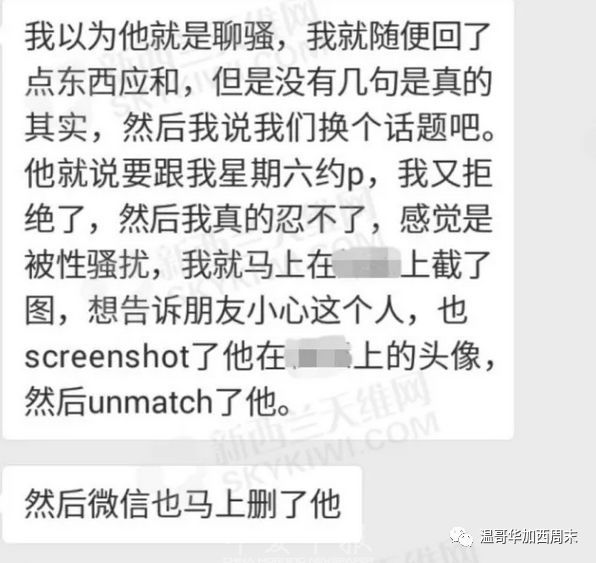 谁知道,对方越说越露骨,硬要和小C周末约炮。小C明确表示拒绝之后,对方还是不依不饶。小C这才觉得对方的问题有点严重,就在聊天软件和微信上都删除了对方的联系方式。