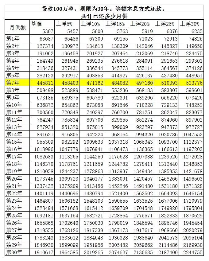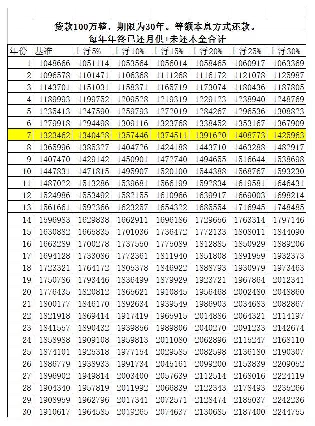 但是房产投资者B比A晚还款1年,也就是只有6年还款。利率上浮多少,会和还7年基准利率月供成本接近呢?通过查询上表可以发现是上浮15%,总成本是1323768元。只比1323462元多306元。从整个7年总成本的角度,是基本相等的。