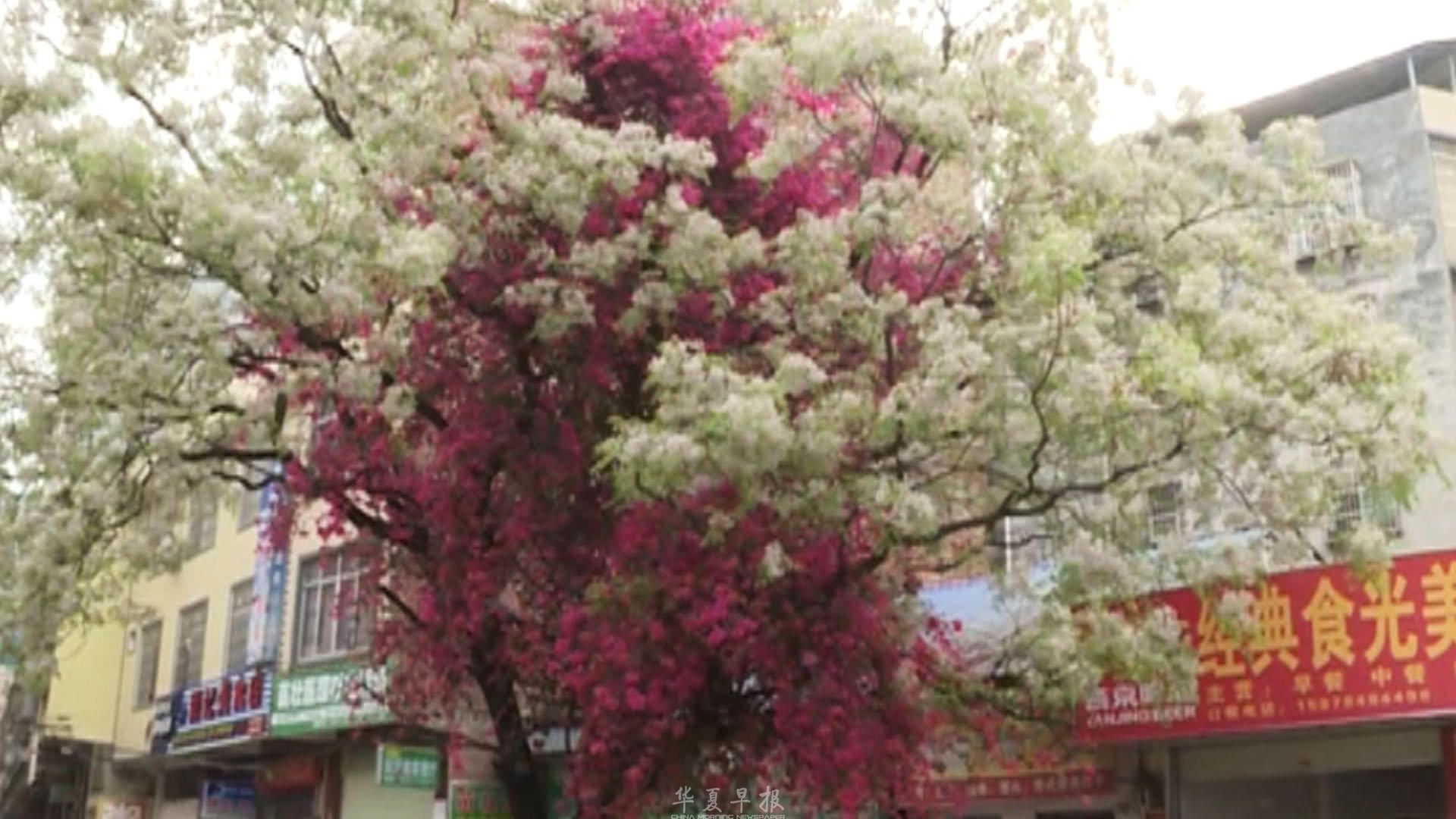 广西百色市平果县城中有这样一棵“树”,是苦楝树和三角梅合抱相生而成,在一起已有18载。