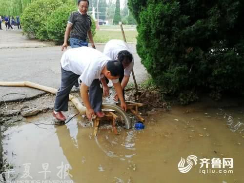 随后,记者进入了校园,发现在学校内部的一处低洼地带,几位老师正在用小型抽水设备清理积水。“这些积水将全部被抽到旁边的池塘里。在雨水被抽干之后,这里也暂时被封闭起来,等安全之后再让学生在这里活动。”一位教师一边忙碌着,一边向记者说道,“我们现在除了上课外,还要做好保障工作,而清理积水就是这些众多额外工作中的一项。”由于天气炎热,老师们身上的衣服已被汗水浸湿,而他们一直守在烈日下,默默地做着这些额外工作。