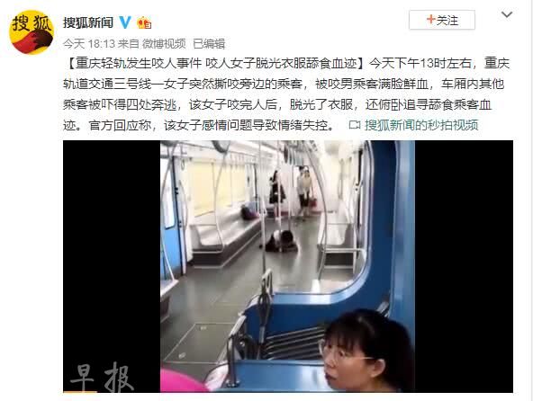 7月18号下午13时左右,重庆轨道交通三号线一女子突然撕咬旁边的乘客。被咬男乘客满脸鲜血,车厢内其他乘客被吓得四处奔逃,该女子咬完人后,脱光了衣服,还俯卧追寻舔食乘客血迹。官方回应称,该女子感情问题导致情绪失控。