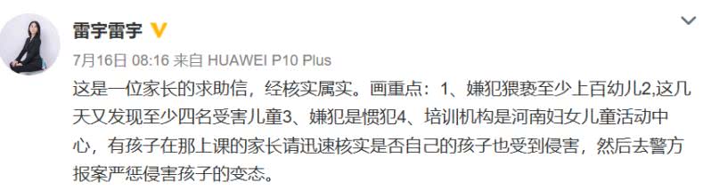 雷宇还在微博上为该事件画重点:1、嫌犯猥亵至少上百幼儿;2、这几天又发现至少四名受害儿童;3、嫌犯是惯犯;4、培训机构是河南妇女儿童活动中心,有孩子在那上课的家长请迅速核实是否自己的孩子也受到侵害,然后去警方报案严惩侵害孩子的变态。