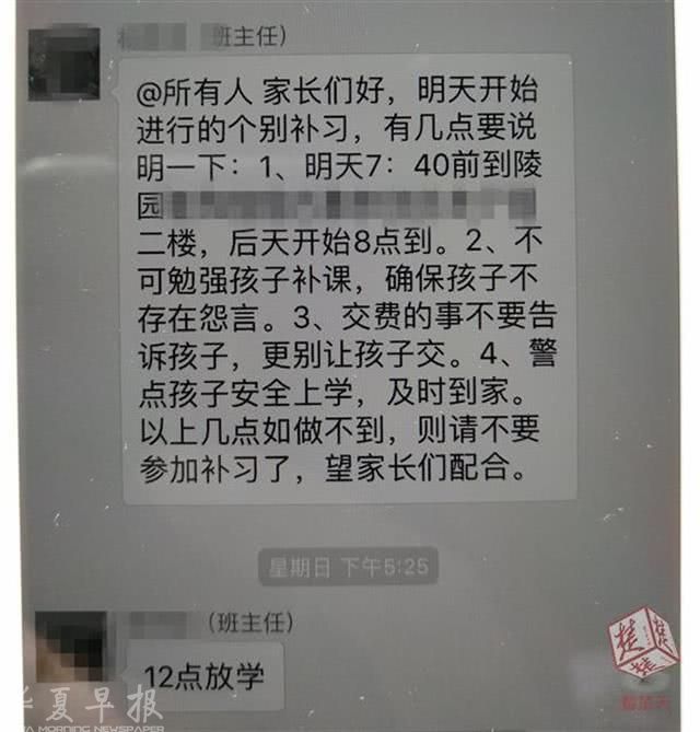 据一名姓刘的学生家长介绍,其女儿在阳新某中学上初二,学校放假期间,老师在群里发通知,称从9号开始,对个别学生进行补习。“不勉强孩子补课,确保孩子不存在怨言。”并要求家长不得将“交费的事告诉孩子,更别让孩子交(费)。”