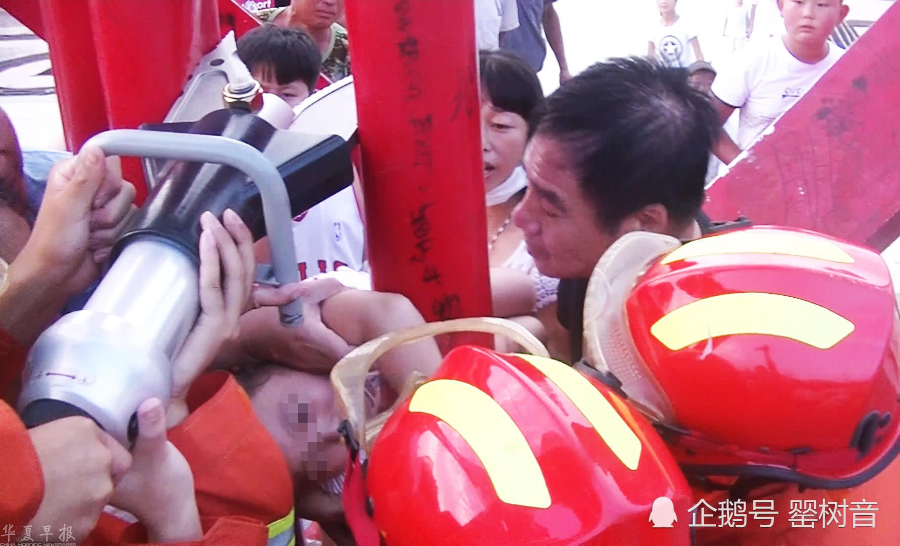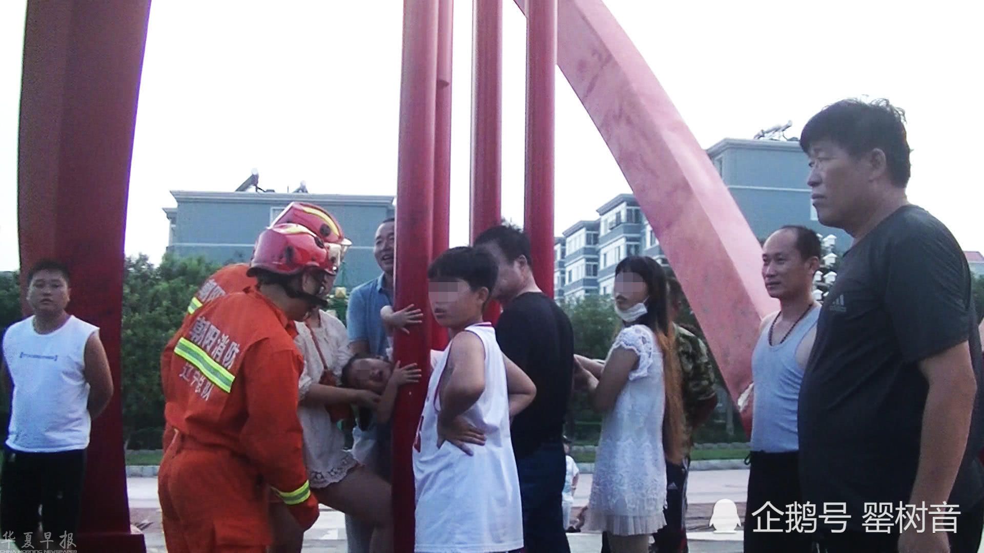 18时28分到达现场,现场侦察发现一女童头部正卡在地标性建筑支撑管道中间,其家长正想办法将孩子身体向上方稍宽敞的地方托举,以减轻小女孩的痛苦。