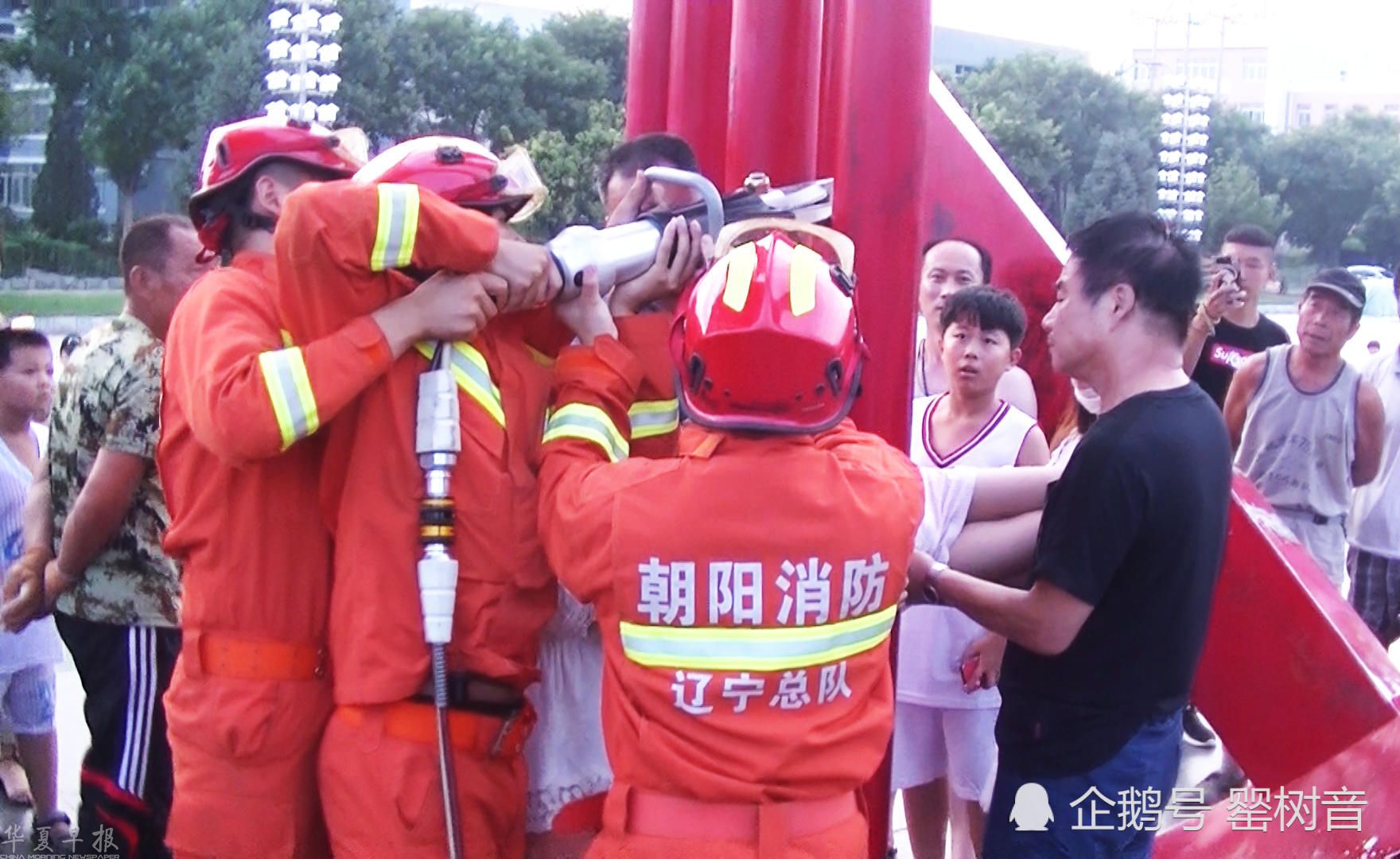 辽宁省朝阳消防支队喀左大队2018年7月22日18时20分接到群众报警,位于朝阳市喀左县大城子镇新华广场有人被卡在广场地标支撑管道中间,中队立即出动1辆消防车6名官兵赶赴现场。