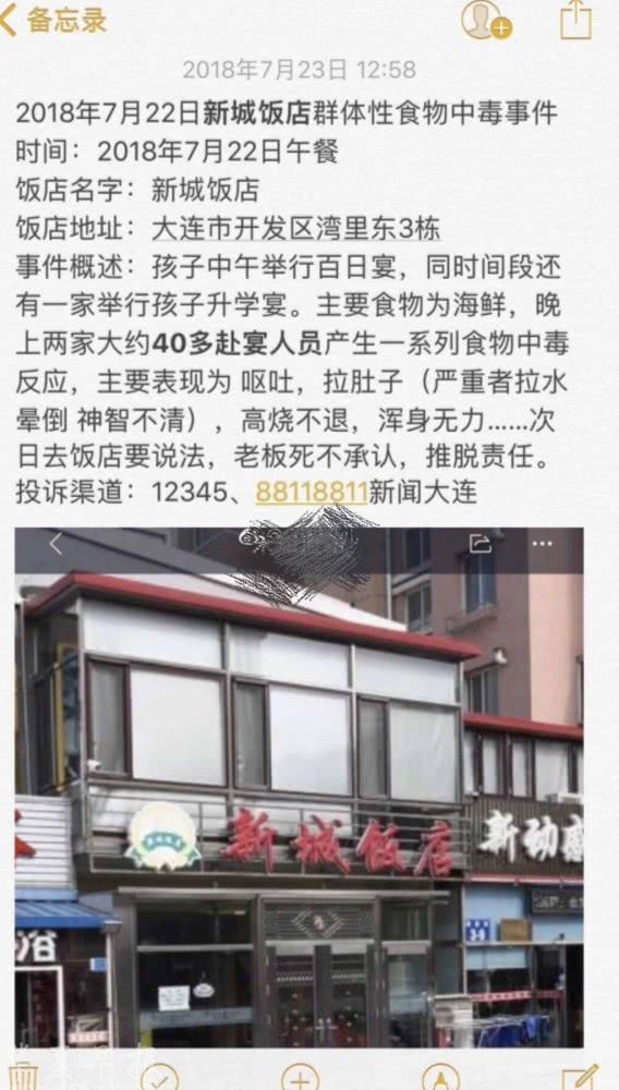 7月23日,据网友爆料,在大连市开发区湾里东3栋新城饭店发生群体性食物中毒事件。网友称,7月22日的中午,自己家的孩子在新城饭店举行百日宴,同一时间还有一家举办了孩子的升学宴。饭桌上的主要食物为海鲜,晚上十点多,40多赴宴人员都出现了食物中毒的症状, 呕吐,拉肚子,高烧不退,浑身无力……第二天,网友去饭店讨要说法,饭店老板死不承认饭店里的海鲜有问题,表示此事与饭店无关。