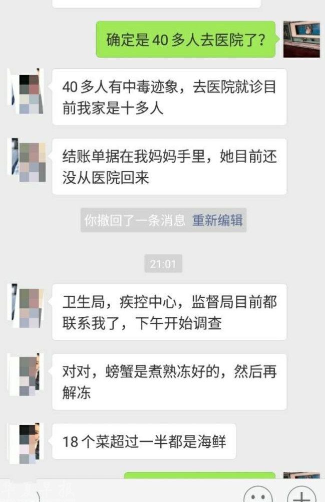 40多人在同一时间相继出现了中毒的迹象,网友怀疑这和中午在新城饭店吃的海鲜脱不了关系,但是饭店老板坚称自己饭店的海鲜与此事无关。网友坦言当时饭桌上有18个菜,超过一半都是海鲜,但是这些海鲜并不都是新鲜的,像螃蟹之类的都是煮熟冻好的,然后有食客点餐后,饭店在解冻烹饪端上饭桌。网友称自己已经把此事上报给相关部门,当地卫生局、疾控中心、监督局目前都以联系事件当事人,对本次事物中毒案件开展调查。