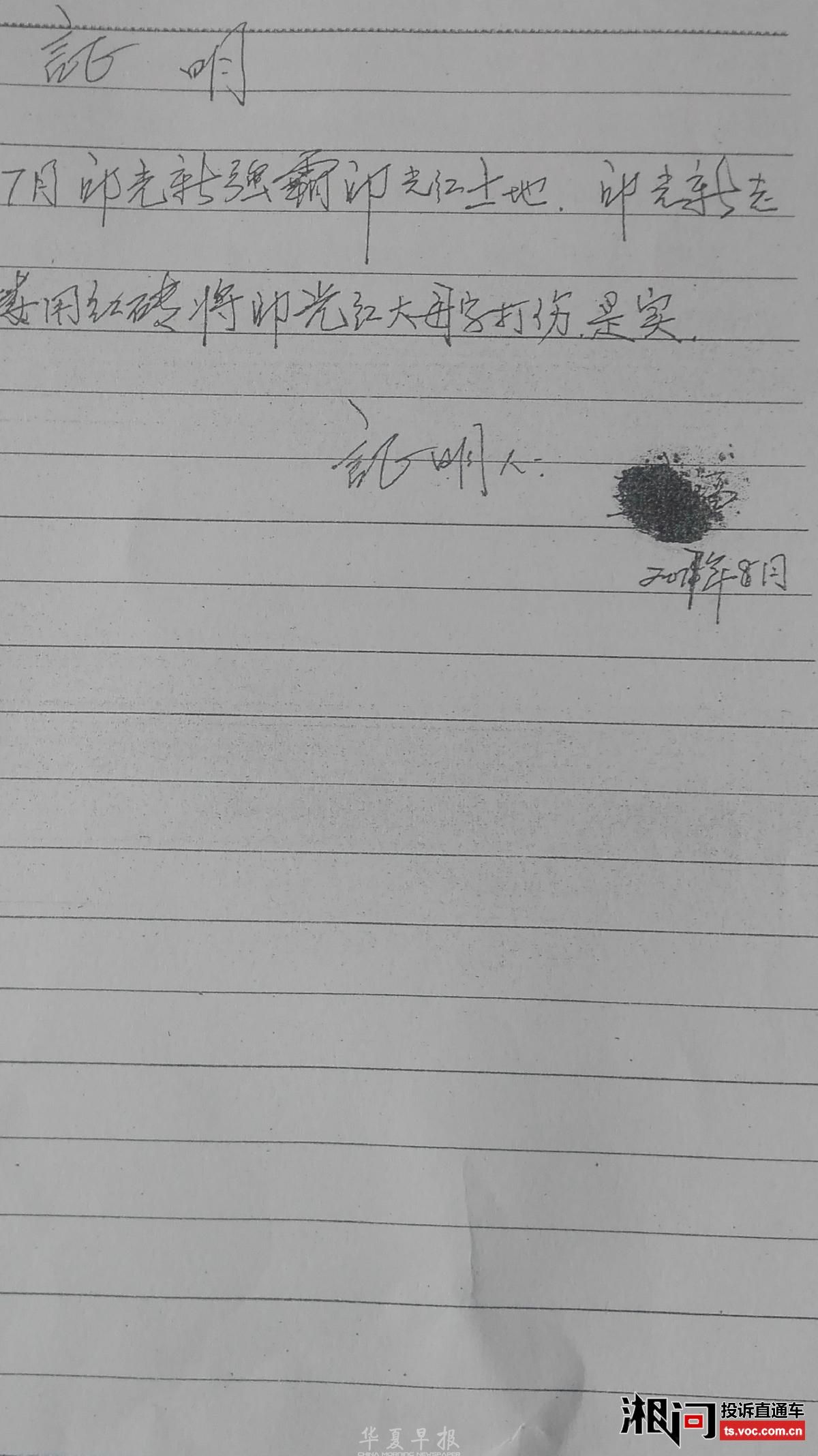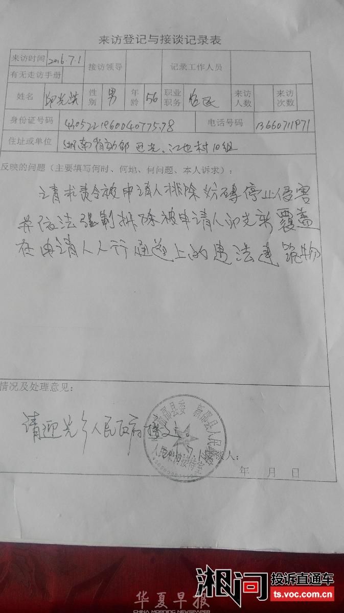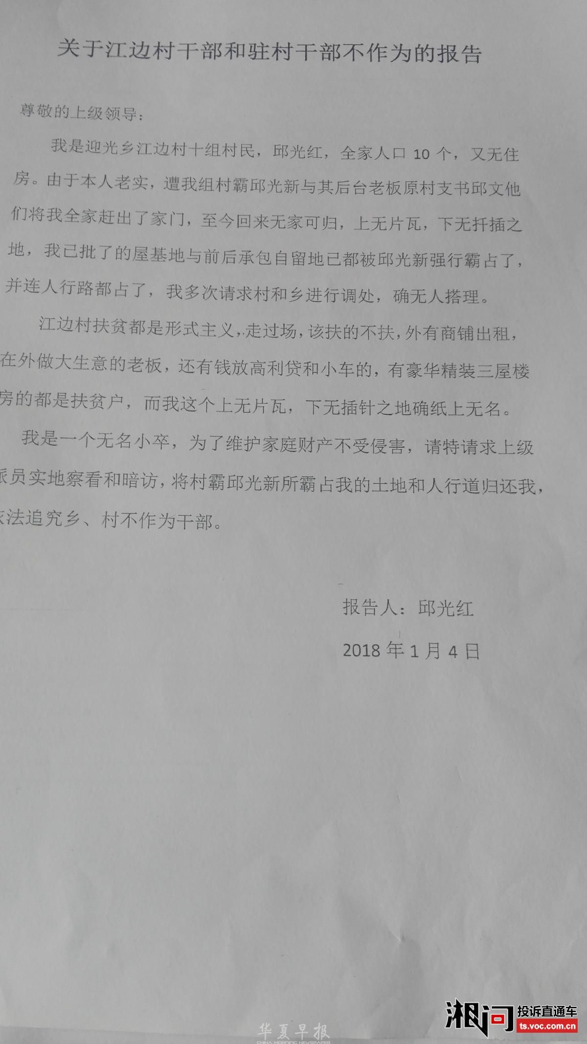 关于求助处理土地纠纷上访遗案的报告 敬爱中央省市纪委监察组领导们好! 我是湖南省新邵县迎光乡江边村10组49号村民,邱光洪,男,汉族,身份证430522196004077578,老实本份农民 。 因1995年被村组村霸邱光新与其后台原村支书邱文陷害,强行将我全家三口人,赶出家门,在外漂泊几十年,当我回家一看时,家中一片狼狈,原本我的宅基地祜强占了,我房屋外出的人行道路也被邱光新强行建房,我与理论,他不但不讲理?反而从楼上用红砖砸伤我,造成住院损失及伤孙鉴定费几万元,还对我多次恐吓报复,为此事我也找过律师、上法院也不立案,报告过派出所也没做任何处理?上访到县人民政府,转介迎光乡政府也不处理?使我徘徊在诉讼上访的痛苦路上,遭受巨大的精神损失和心灵创伤,在强权、权势之下,一个可怜的贫民百姓,一直徘徊在漫长的诉讼与痛苦之中!我至今无家可归,上无瓦片,下无插针之地,现我快六十岁了,总不能在外漂泊劳工一辈吧?好想有家安息栖居,破旧的房子想整修一下,又苦于没钱,毕生心血积蓄全花在这场土地诉讼纠纷上,这样的情况,乡政府连危房改造补助都不给予安排?我又无车、无商品购置房、大型农业机械,好多家有豪华楼房、小车、在外购房,放高利的都能享受建档立卡及危房改造的补贴,而很多真象我这样的家庭却拒之政策大门之外……今年国家开展土地确权完善制度,我的土地都有合法登记手续,至今无法确权登记确认?很多善良群众都知道这个情况,惯感不平?却是爱莫无助,敢怒而不敢言? 问题一直反映上去,转介当地人民政府后,一直推诿,不了了之……一直得不到有效处理?使侵害他人合法财产权益违规违纪行为逍遥于法外…… 在当今十九大会议召开后,法治推进不断完善的新时代!各项民生政策惠及农村,形势大好!为何难以落到实处?中央政策利好,但到了基层乡镇村确实存在不作为乱象,民众呼声强烈!希望中央加大反腐力度,反不作为,将利剑向农村延伸,到了地方基层却那么不现实?为何上京去访还被拘留打击,承受各种报复之痛? 我是受害者之中的一个典型案例,我们不懂法,权益如此遭到侵害! 不知农村还有多少象我一样的老实本份农民,正在忍受欺凌与痛苦挣扎…… 我们上天天无路;入地地无门?天高皇帝远! 知道党中央关心人民群众,各项政策也倾注农村民生的温寒! 我们相信党中央,拥护习主席,能有再现青天,下到基层深入农户调查,为民做主,打击地方村痞地霸,基层政府存在的个别执政乱象行为予以纠正,利国利民, 为人民群众排忧解难,构建真正的文明和谐社会,确保地方治安维稳,人民安居乐业! 我所反映的一切事实真实无假,一切有真实材料图片、也有证人证言…… 今特报告前来叩求上级纪检监察部门领导予以重视!严惩妨碍停止侵害强行覆盖我房屋人行道及强占我地基违法建筑,保证公民合法使用权! 望上级纪委巡视督查,了解实情,为民做主,伸张正义,还我公道,保护人民群众的切身利益! 青天在上,叩求万谢! 求助人:邱光洪本人 电话:13660711971。