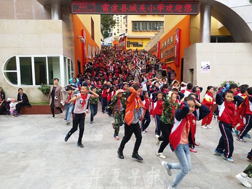 各班返回教室后,开展了地震、火灾等自然灾害的应急避险、应急疏散演练。孩子们根据口令,动作娴熟,迅速躲在课桌下面,两手握住课桌腿;得到疏散指令后,48个班级的学生在老师的指挥下,有序疏散到锦屏广场。