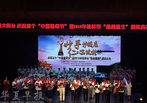 华夏早报广西桂林讯(记者 许林)8月19日晚,庆祝首个“中国医师节”暨2018年桂林市“最美医生”颁奖典礼在广西桂林市少年宫举行,何社华等10名医生被评为2018年桂林市“最美医生”。