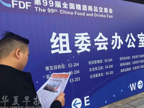 参展厂家代表在阅读华夏早报印刷版糖酒会专版。 特派记者 娄义华摄