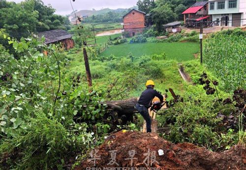 截至6月20日上午11时,邵阳供电公司累计出动107支抢修队伍,1060名抢修队员奋战抢险一线,已恢复1402个台区的11.59万用户供电。图为运维人员在北塔区10千伏磨茶线倒树抢修现场。