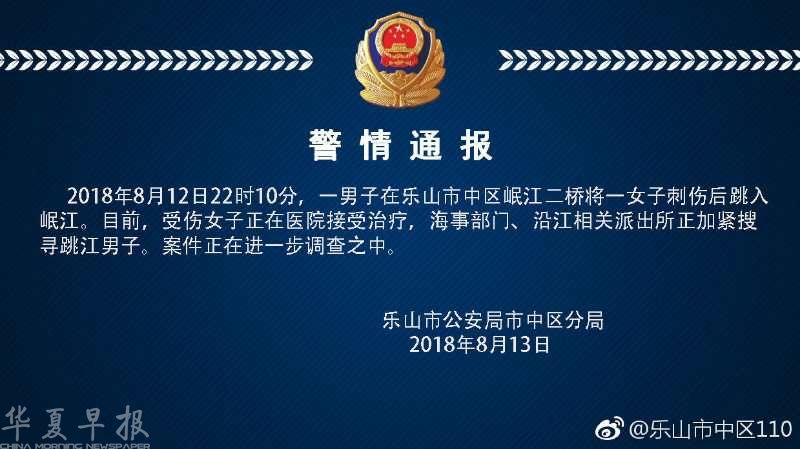 乐山市公安局市中区分局警方通报称,8月12日22时10分,一男子在乐山市市中区岷江二桥将一名女子刺伤后跳入岷江。受伤女子正在医院接受治疗,当地海事部门、沿江相关派出所正加紧搜寻跳江男子,警方正在进一步调查。