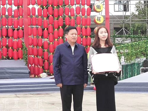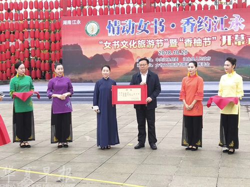 江永县委书记给李雨儿颁发女书文化艺术宣传大使聘书。 尹奋松摄
