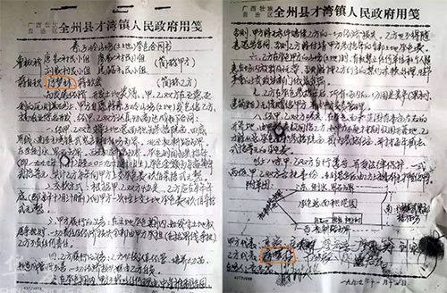 全州县才湾镇鲁板桥村一份土地承包合同显示,1999年,廖梦林、蒋钦宏两人(以下简称乙方)与鲁板桥村唐家村民小组、刘家村民小组、廖家村民小组、上马路村民小组(以下简称甲方)签订了一份名为《索子岭山场(山地)承包合同书》的协议。