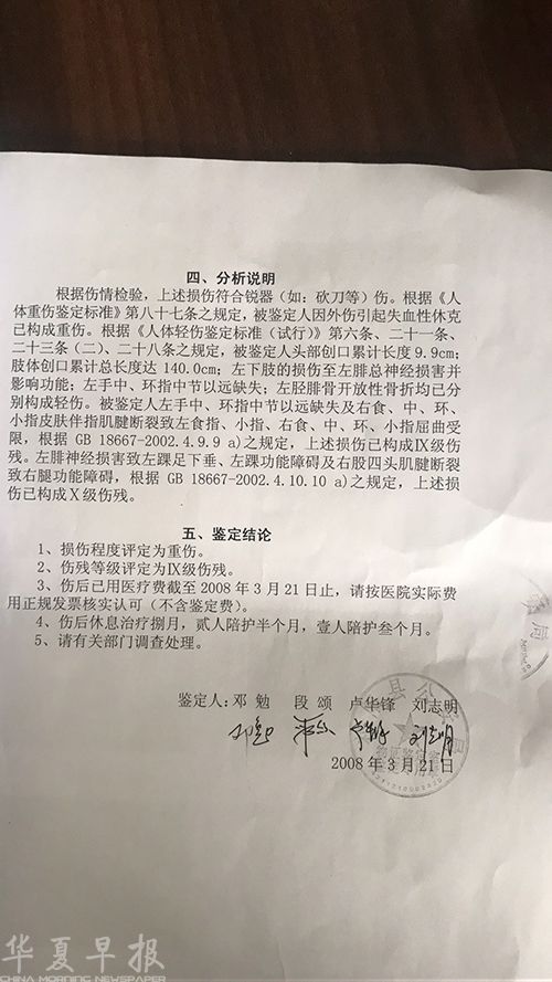 “住院32天,共花费医疗手术费6万多元,才保住了性命。但双手被砍断了6根手指,双脚脚筋也被砍断无法治好,已成终身残疾,基本丧失劳动能力。经过四年多的后续治疗和疗养,伤情才逐渐有所稳定。”邓建强告诉记者,2008年3月21日,他被法医鉴定为重伤、IX级伤残(即九级伤残)。