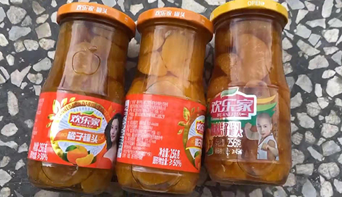 三个不同日期生产的桔子罐头放在一起,颜色对比非常明显。而2019年4月13日与2017日4月1日生产的桔子罐头轻轻摇晃后,均果汁浑浊,果肉摇晃后就破碎,2019年1月12日生产的桔子罐头就没有出现这样的情况。