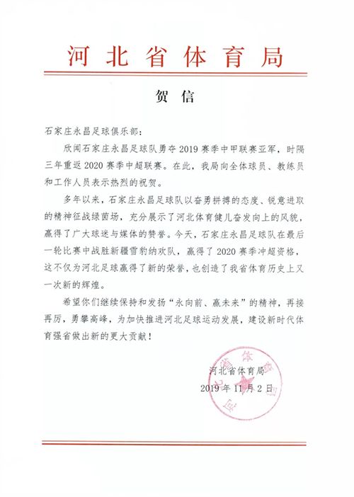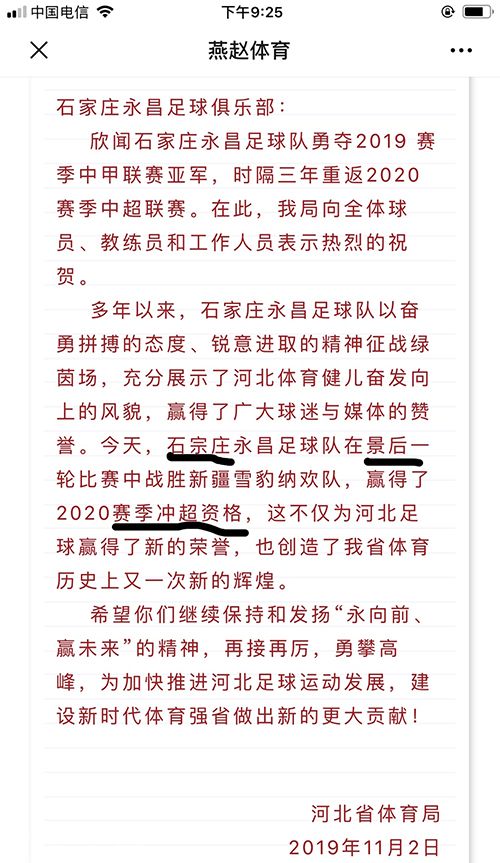 华夏早报讯(灯塔新闻记者 董哲)11月2日,2019中甲联赛第30轮,石家庄永昌坐镇主场河北奥体中心迎战新疆雪豹纳欢。最终以2:0 战胜新疆,成功取得下赛季中超联赛名额。这本来是一件可喜可贺的事情。但是让人大跌眼镜的是,河北省体育局通过官方微信公众号“燕赵体育”向石家庄永昌足球俱乐部发出的一封祝贺信中,竟然有两处明显的错别字。网友们直呼:“编辑的语文是体育老师教的吗?”