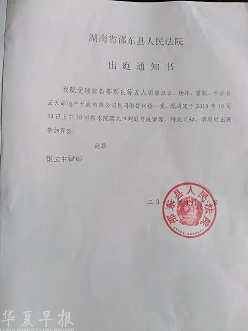 华夏早报-灯塔新闻在一份《湖南省邵东县人民法院出庭通知书》(现为邵阳市代管的县级邵东市)中看到,该通知书称,“我院受理原告郭军良等五人诉曾汉云、杨洋、曾凯、平乐县云天房地产开发有限公司民间借贷纠纷一案,现决定于2019年10月30日上午10时在本院第九审判庭开庭审理,特此通知。请准时出庭参加诉讼。此致银立中律师。”落款日期是2019年9月18日,日期上盖的是“邵东县人民法院”的公章。