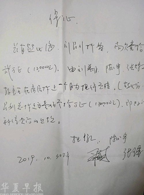 此后的10月30日,南城街道办事处龚川兵副主任再次将熊碧海约到办公室,要求他签订修改后的征地补偿协议,“拆迁房屋面积没改,只是我女儿的安置费添加上了。南城街道办事处还邀请了铜梁区人大的三位领导参与协调,洽谈对我的征地拆迁。”熊碧海告诉记者。经过结算后,他的鱼池和房屋拆迁费共计130万元。“铜梁区人大三位领导担保承诺征地拆迁合法,同时他们承诺办事处会足额支付到位拆迁费后,我便签了协议。”熊碧海说。