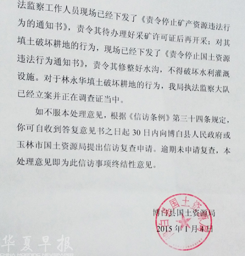 2018年7月1日,《广西日报》刊登中央环境保护督察“回头看”交办信访件办理结果公示(广西第14批),其中编号为D450000201806210014信件显示:玉林市博白县东平镇塘龙村岭尾石场(老板林永华)在付广坟山岭采石过程中,导致山体崩塌、水土流失、大窝肚泉水断流,使居民饮用水受影响。石场将碎石和碎渣堆放在农田,导致村民无法种植农作物。石场附近道路运输产生的扬尘大。放炮时产生振动导致村民房屋被震裂。该石场砍伐山上树木,毁坏村民的田都未给予村民赔偿。2016年向中央环保督察组反映过后,当地政府责令整改后现仍继续营业。