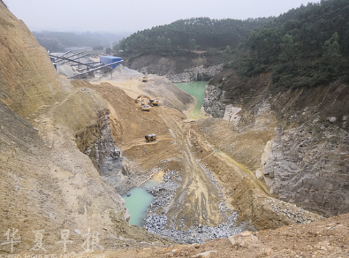 顺着道路前行,一个占地数十亩的岭尾石场进入眼帘。石场上一片繁忙,机器输送带不停地转动,周围几个像小山一样的石料堆之间,2辆运料车穿梭其中。不远处,3台挖掘机和1台钻孔机(钻炮眼)正在作业。石场背后,是已被开采得面目全非的山体,庞大的山体被挖得千疮百孔,还出现了一个大坑,大量的岩石裸露在外,部分泥土出现裂开和滑落现象。